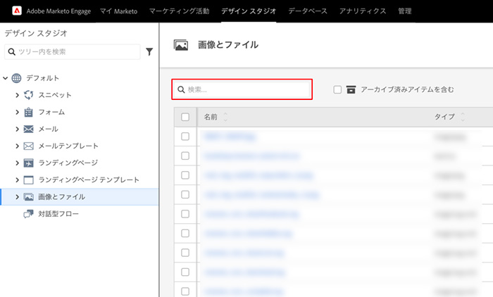 しかしマーケティング活動やデザインスタジオの「ツリーを検索」でも、右上のサーチアイコンからの検索でも、URLだとアセットは出てきません。